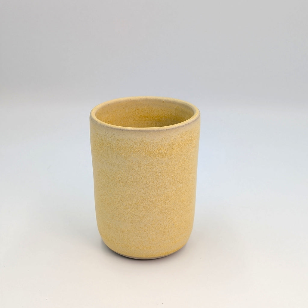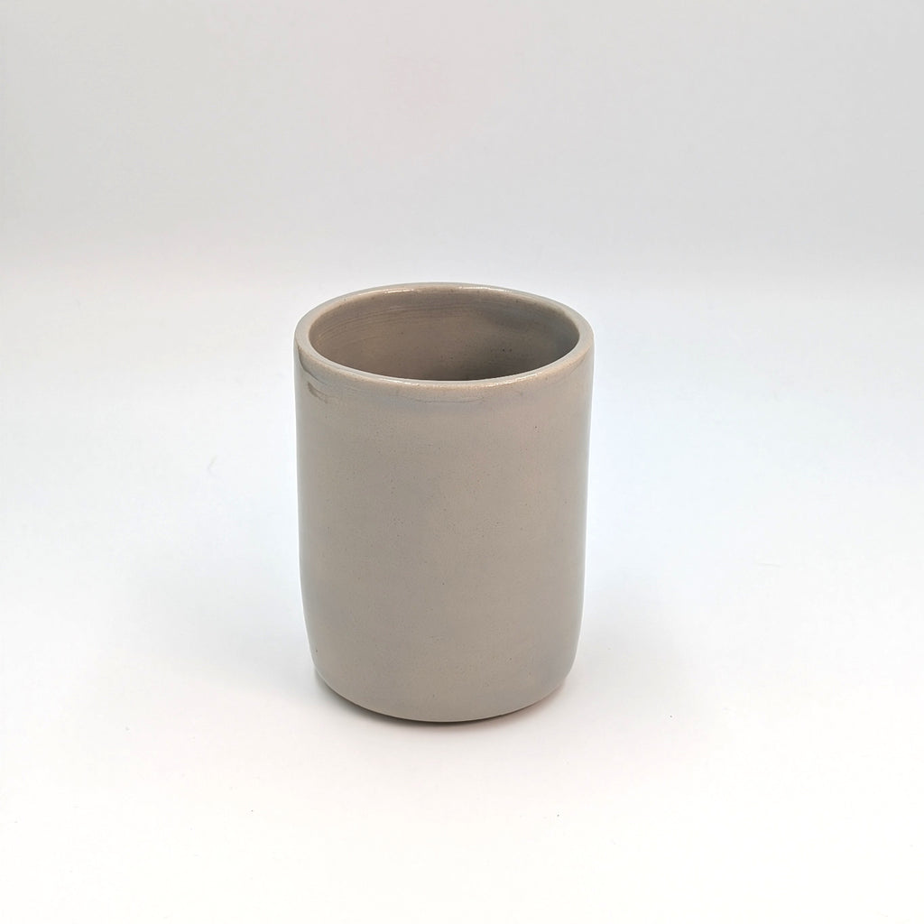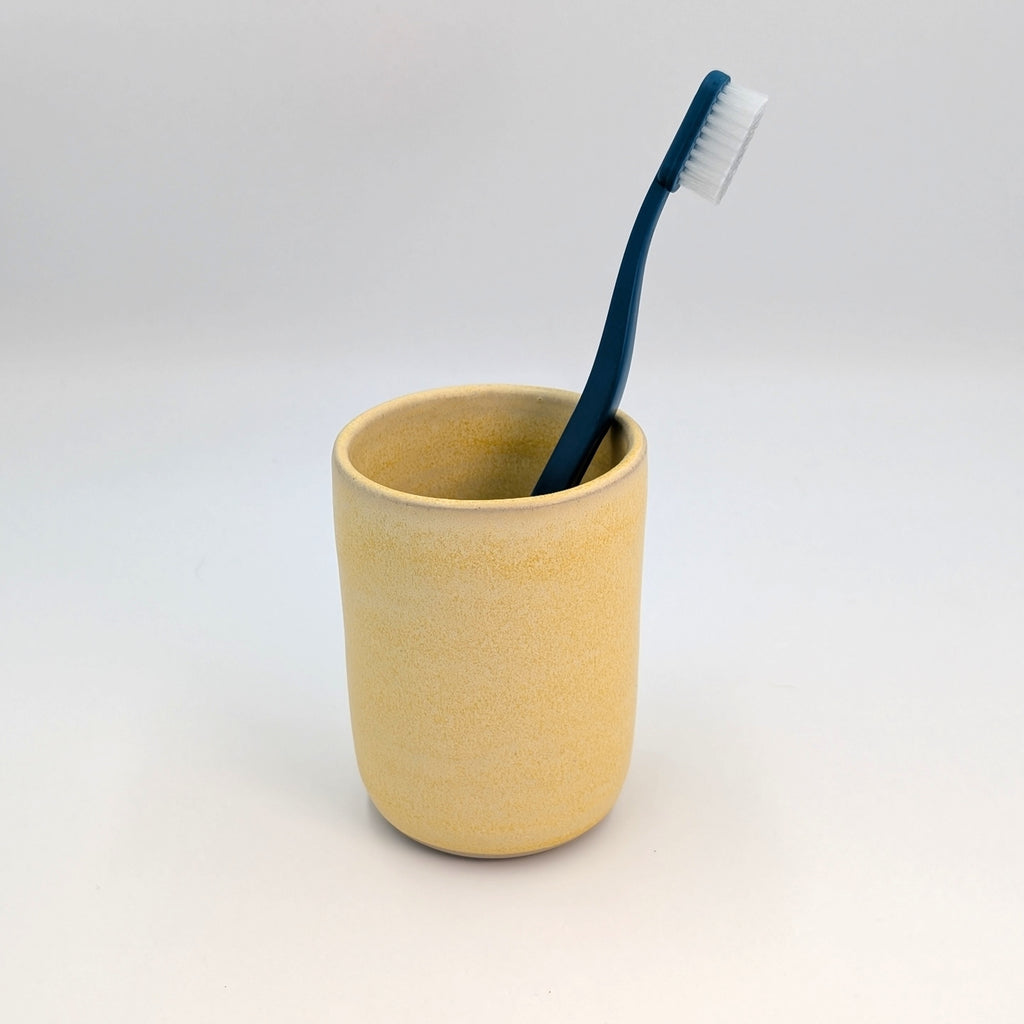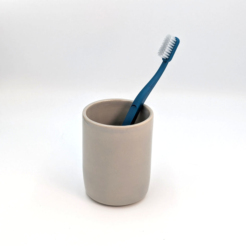 Enkle, håndlavede tandkrus og tandbørsteholdere i stentøj. De står stabilt, holder børsterne oprejst og lader dem tørre mellem brug – et roligt, funktionelt valg til badeværelset.