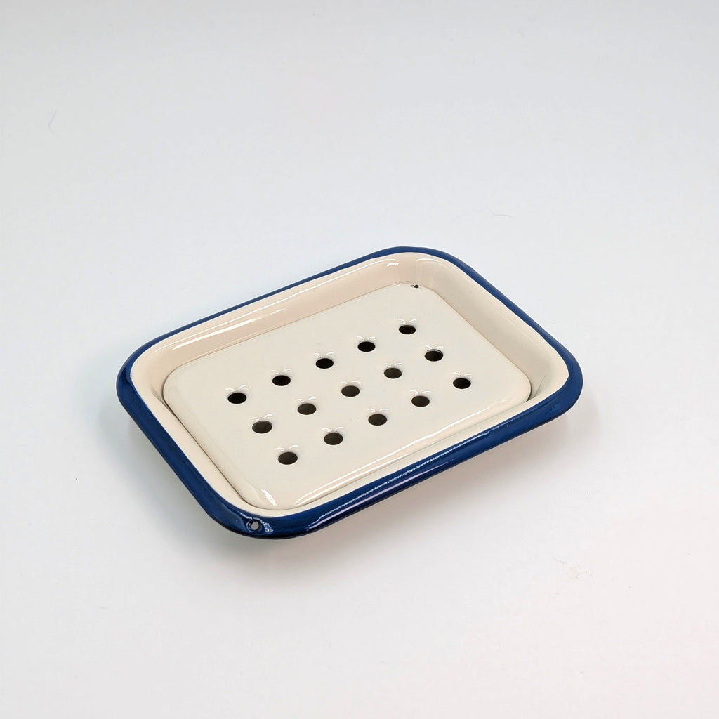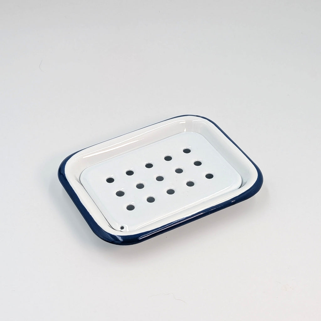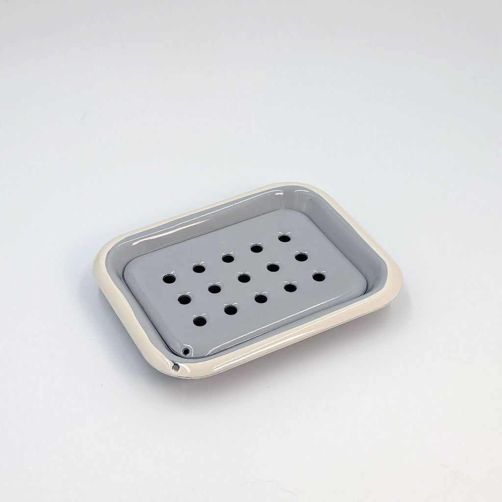 En klassisk todelt sæbeskål i emalje, hvor sæben hviler på en rist, mens overskydende vand opsamles i underskålen. Et praktisk design, der passer både i badeværelse, køkken – eller som en del af den enkle sommerhusstemning.